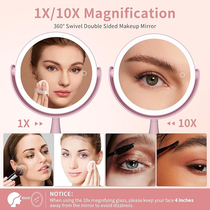 Makeup Mirror with Lights, 1X/10X LED Magnifying Vanity Mirror, HD Lighted Mirror for Desk, 3 Color Lights Adjustable Brightness, 360° Rotation 2-Sided 7.6" Dorm Room Mirror, Women Birthday Gifts