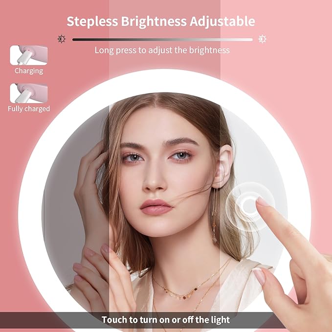 • 【3 Colors Touch Screen Vanity Mirror with Adjustable Brightness】The lighted makeup mirror offers natural, warm, and cool lighting modes with adjustable brightness which can meet the makeup needs of different scenes and different lighting environments. The round desk mirror comes with 64 energy saving LED lights with 50,000 hours life.Long press touch switch can adjusts the light intensity, short press touch button can change the color of the light, the soft lighting protects your eyes, ensuring comfort during extended use