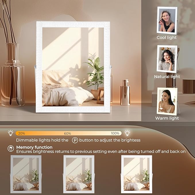 - Smart Touch Control & 3 Lighting Modes: This versatile LED mirror features cold, warm, and natural light settings, along with touch-controlled dimming from 10% to 100%. Easily switch between professional-grade cold light for detailed makeup