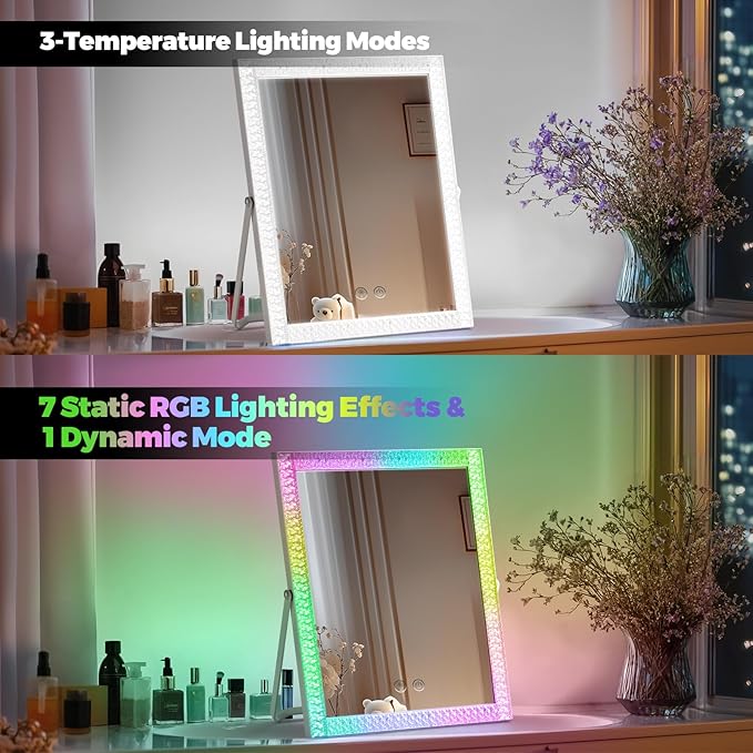- RGB Lighting:This mirror with lights offers 7 static colors and 1 dynamic lighting modes. Switch effortlessly with a touch-sensitive button,where colors change irregularly, offering endless possibilities to match your mood or décor
