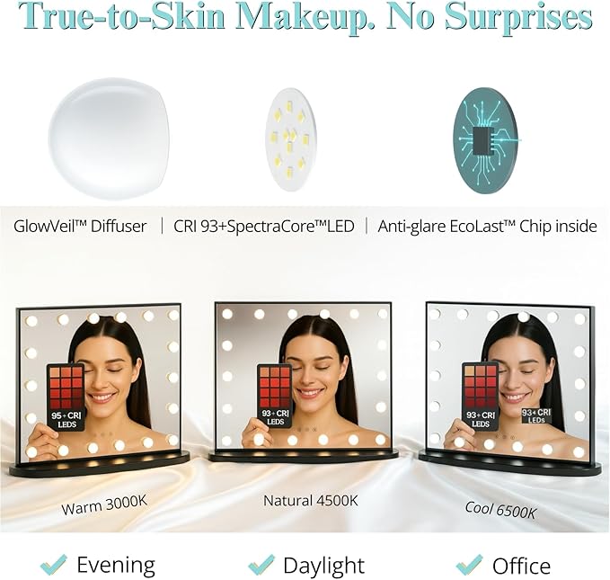 LUXFURNI Hollywood Glamour Vanity Mirror with 4 Extra Bottom Bulbs | Shadow-Free, Perfect Makeup View | Desk & Wall Mountable | 3 Color Modes for Office, Outdoor, Party Looks | USB Charging