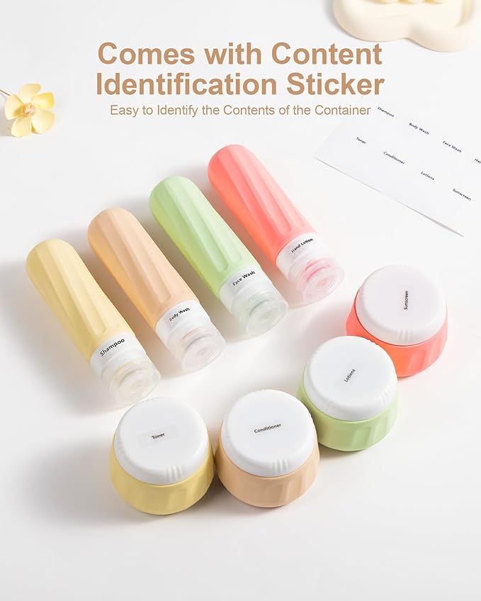 - Travel Size Toiletries: Set includes 4 silicone squeeze bottles 3oz(90ml) and 4 silicone cream jars 3oz(90ml) and clear make-up bag 6.46x2.87x5.31inch. Contents identification label sticker included