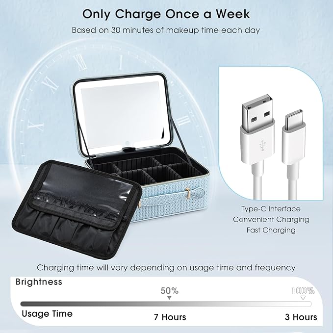- 【ONLY CHARGE ONCE A WEEK 】- The LED mirror is equipped with a built-in 2000mAh battery, alleviating concerns about battery life during use. Based on an average daily makeup time of 30 minutes, it typically requires charging only once a week. It is important to note that charging duration may vary depending on usage time and frequency.