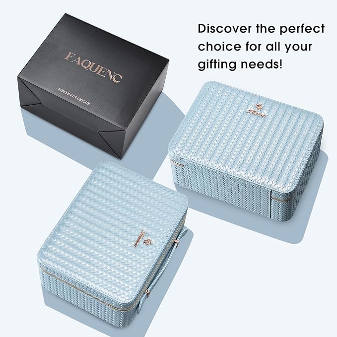 - 【VERSATILE PORTABLE MAKEUP BAG】- Its portable 11.4"x4.7"x8.7" size suits travel and daily use for all skill levels. The spacious makeup bag is thoughtfully designed with a dedicated makeup brush organizer, a gift box and a 4K silver-plated makeup mirror with three adjustable lighting modes. Ideal for business trips or personal outings, it allows for easy transport of your vanity essentials. Faquenc cosmetic bag features a sturdy structure made of exquisite synthetic leather that is waterproof and abrasion-resistant.