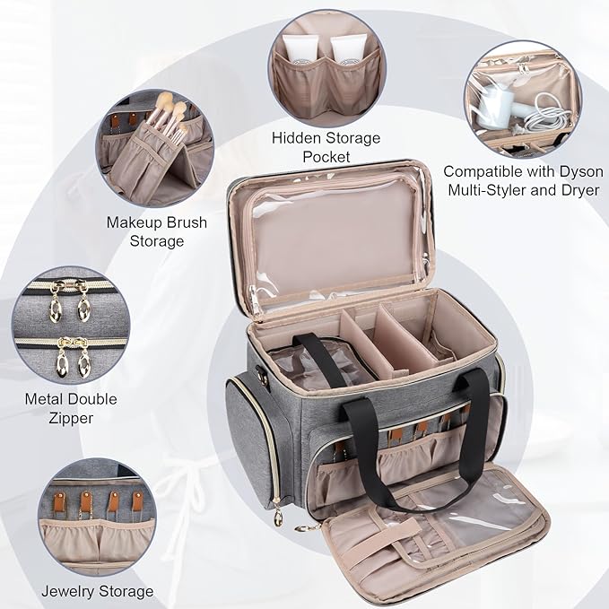 - Well-organized Compartments: The main compartment has two flexible, removable dividers that can store cosmetics of various sizes. The main compartment has 2 inner small pockets and 2 clear toiletries pouches for neatly storing your cosmetics and travel toiletries. The spacious transparent pocket at the top can hold small hair straighteners and other hair care products