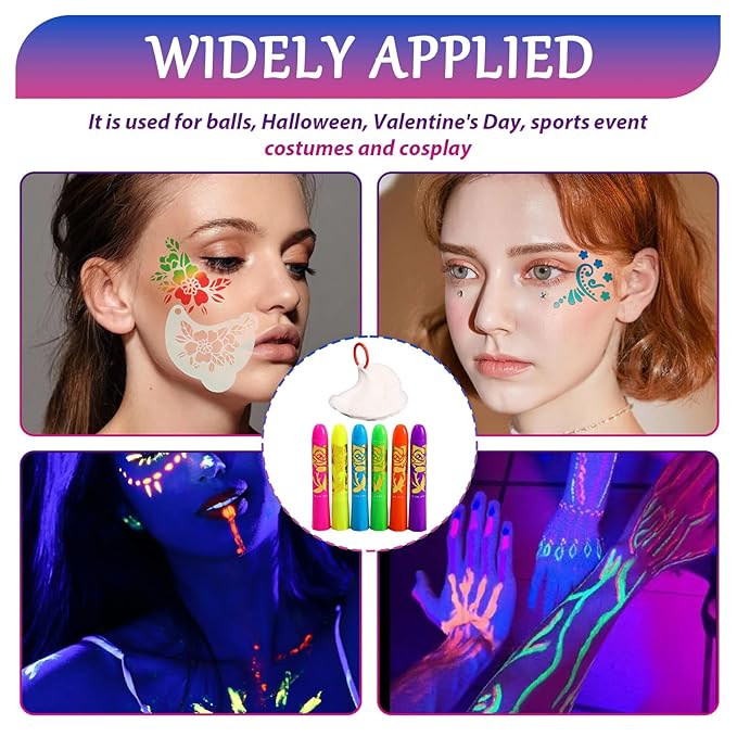 - Easy Application &Blendable: Six vivid glow‑in‑the‑dark paint pens twist up smoothly for simple application on face and body, blendable shades allow creative designs under UV or black light for parties and events