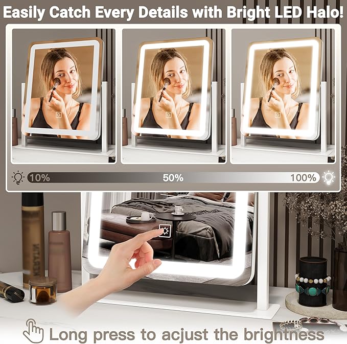 - đăSmart Touch Sensoră Smart touch buttons for this light-up vanity mirror Simply short press power ON/OFF & change the light color, and Long press to adjust the brightness. We keep all the Functions the one touch, it can serve you great