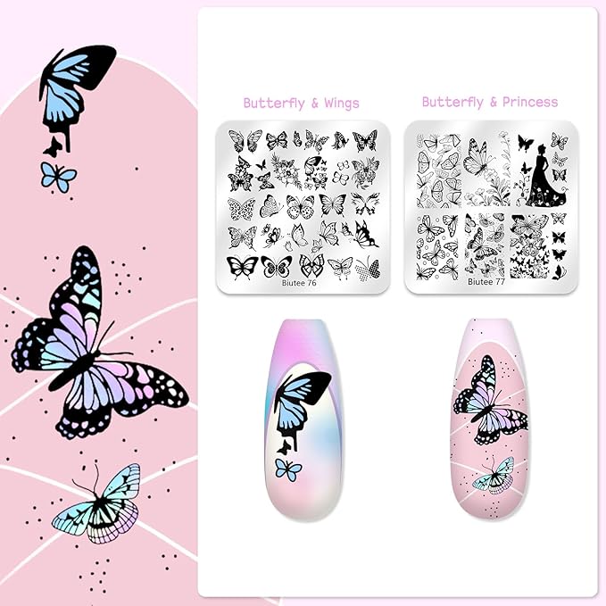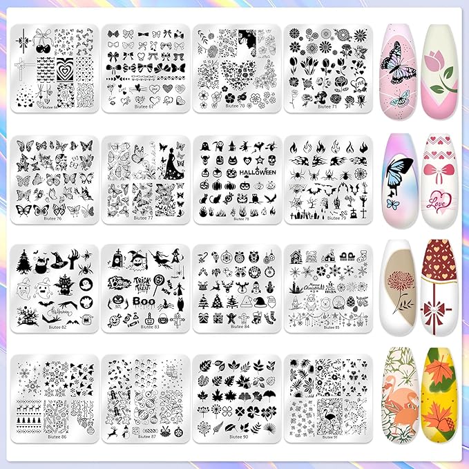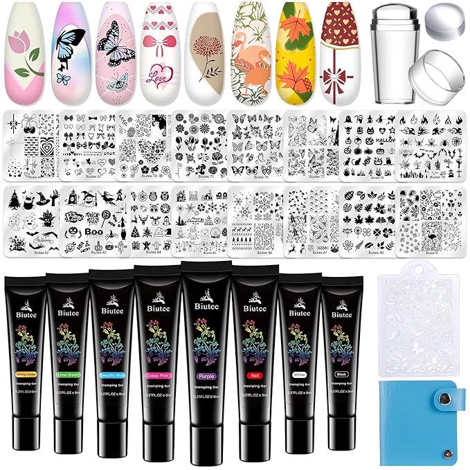 Biutee Nail Stamper Kit 16Pcs Nail Art Stamping Plate 8 Colors Stamp Polish Gel Silicone Stamper Scraper with Storage Bag, Nail Stamp Plates Love Flower Butterfly Leaf Template Valentine Design Gift