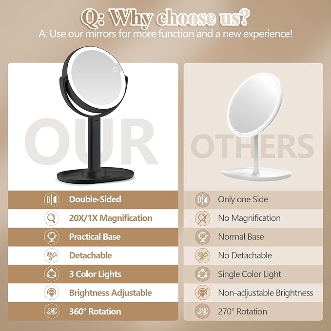 - 【Present for Women】Our makeup mirror with lights and magnification has versatile multifunction can not only be desktop mirror, handheld mirror, also can be hanging as wall mirror. Whether as womens birthday present, mother's day present, Valentine's day present or Christmas present. All very nice choices.