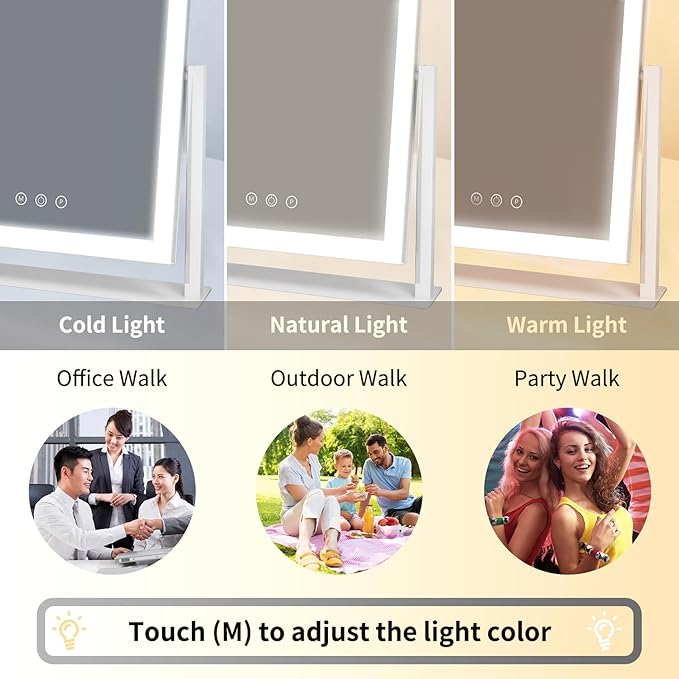 - 【Three-Color Lighting for Quality Makeup】This makeup mirror with lights offers three lighting modes (cool white, warm yellow, natural light) to suit any environment. It's ideal for precise makeup application or skincare at your desk, bedroom, or dorm. Easily switch brightness and tone for perfect results.