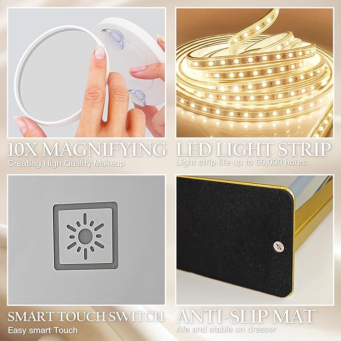 ROLOVE Gold Vanity Mirror with Lights 14x11 Inch, Lighted Makeup Mirror, Smart Touch 3 Colors Dimmable, 10X Magnification, Dresser Mount, Modern Style