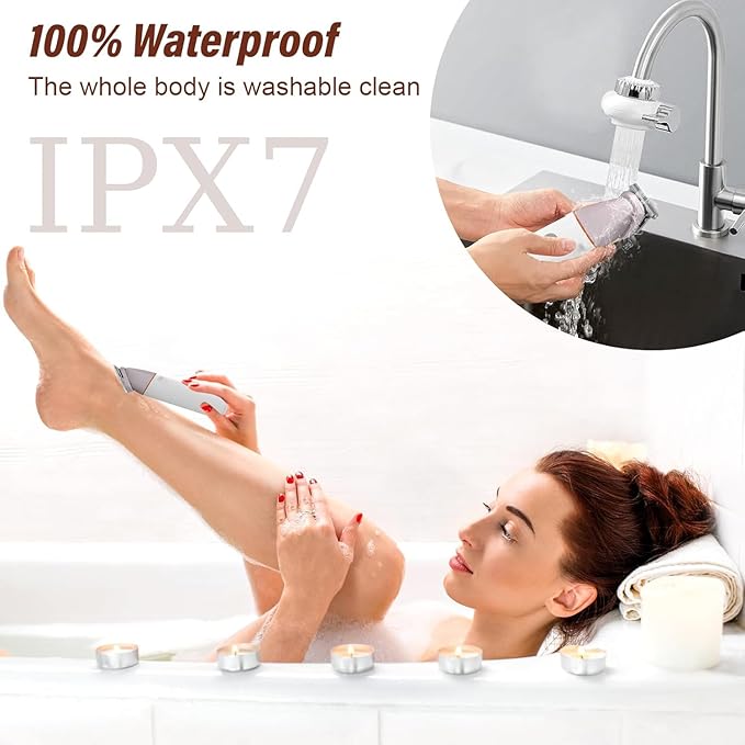 - 【Dual-Use for Wet and Dry】IPX7 Waterproof electric trimmer for women is designed for both wet and dry use. Enjoy worry-free use of the pubic hair trimmer and facial hair removal for women, even in the soothing ambiance of your shower or bathtub. After use, it's recommended to apply a little moisturizer or skincare lotion for sensitive skin protection.