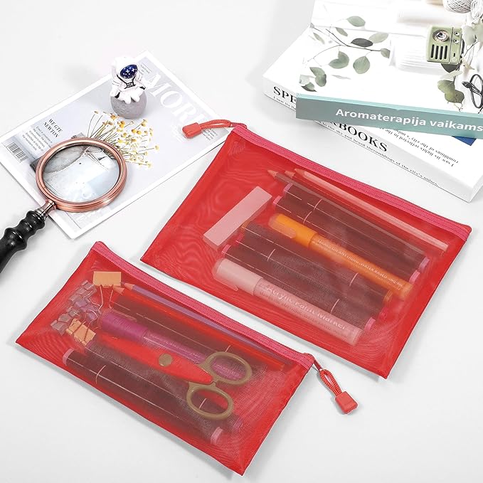 12 Pieces Zipper Nylon Mesh Pouch, Mesh Cosmetic Bags Makeup Bags Pencil Case, Multipurpose Travel Bags for Cosmetic School Office Supplies and Travel Accessories (Red, A5)