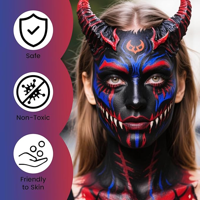 - [Professional Face Body Painting Set] Our face painting foundation comes in various color combinations and is equipped with three makeup brushes to help you create different Halloween special effects makeup looks. For instance, light blue, white and black can create Sully makeup and zombie bride makeup. Blue, red and white can create American flag makeup and clown makeup. Black, white and grey can create skull makeup, gothic makeup and so on