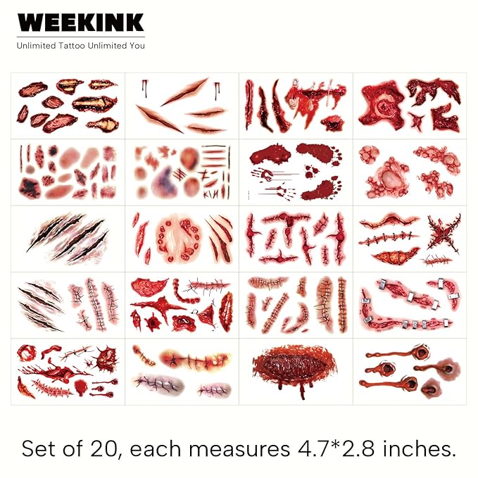- 20 SHEETS HORROR TATTOOS: This set includes a wide range of realistic scars, bloody wounds, scratches, stitches, and bruises for creating scary and creepy Halloween looks. Rich styles let you mix and match for different Halloween themes—zombie, vampire, ghost, or monster—making your look more dramatic and spooky.