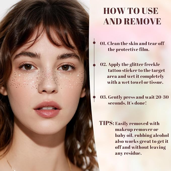 - 【Easy to Use and Remove】: Remove the transparent film, place the glitter patch on dry skin, moisten with water, and get a natural glitter in 30 seconds. Removal: Using regular baby oil or rubbing alcohol can be a good way to remove freckles without leaving any residue.