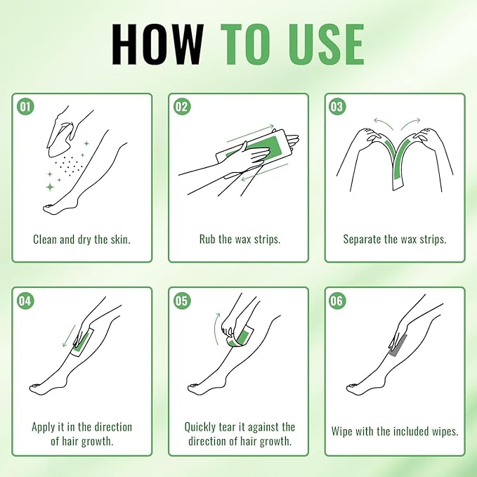 - Remarkable effect:Wax strips can firmly adhere to each hair,completely remove the hair from the root, and effectively extend the hair regeneration cycle.After using wax strips for hair removal,your skin immediately becomes silky and smooth.Waxing strips is suitable for all skin types,and even first-time users can safely enjoy the gorgeous transformation of their skin.Try wax strips body and experience an unprecedented hair removal experience