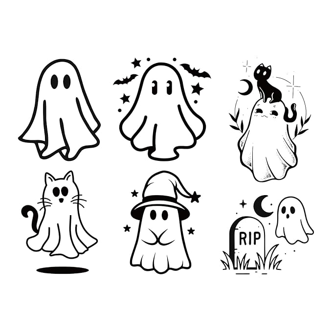 - 6 UNIQUE GHOST DESIGNS: Includes 6 different ghost tattoos with playful details like a witch hat, black cat, stars, and RIP gravestone, perfect for Halloween fun.