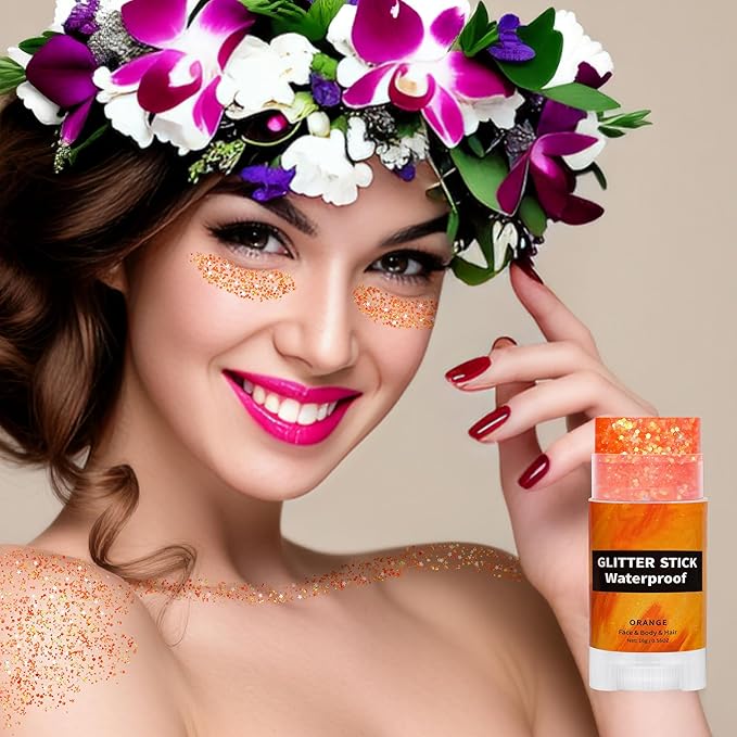 - SAFE INGREDIENTS AND WATERPROOF:Orange body glitter stick is made from gentle, non-toxic ingredients that are safe for all ages, including kids. Whether it's for a halloween,costume party, festival, it leaves a waterproof and long-lasting glitter of sparkling that stays put through rain or shine