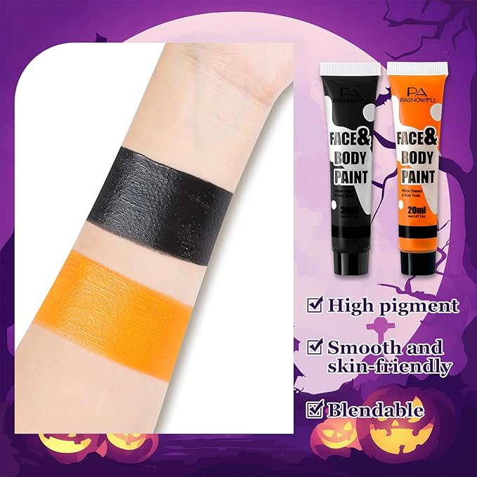 - [Washable Face Paint] Our face and body paint uses a water-based cream formula that washes off completely with just soap and water. This easy-to-remove formula eliminates the need for harsh scrubbing or chemical solvents, you can quick and convenient cleanup after Halloween parties, cosplay events, or stage performances. Unlike oil-based products, this washable paint rinses off completely without leaving sticky residue or stains on skin and clothing.