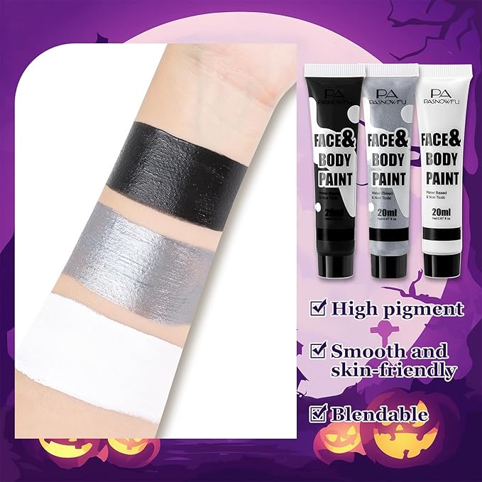 Black White Silver Face Paint - Water-Based Non-Toxic Face Body Paint Kit for Vampire White Tiger, Full Coverage Washable Formula for Halloween Cosplay, Costume Parties,Stage Performances