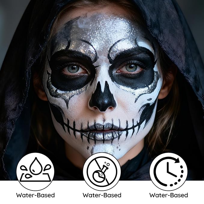 - [Washable Face Paint] Our face and body paint uses a water-based cream formula that washes off completely with just soap and water. This easy-to-remove formula eliminates the need for harsh scrubbing or chemical solvents, you can quick and convenient cleanup after Halloween parties, cosplay events, or stage performances. Unlike oil-based products, this washable paint rinses off completely without leaving sticky residue or stains on skin and clothing.