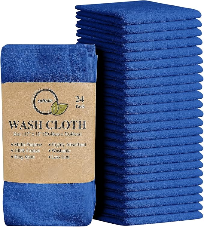 Softolle 100% Cotton Washcloths 24 Pack (12x12 Inches) Soft, Highly Absorbent Washcloth, Face Towels, Wash Cloths for Face, Ring Spun, Bulk Pack (Royal Blue)
