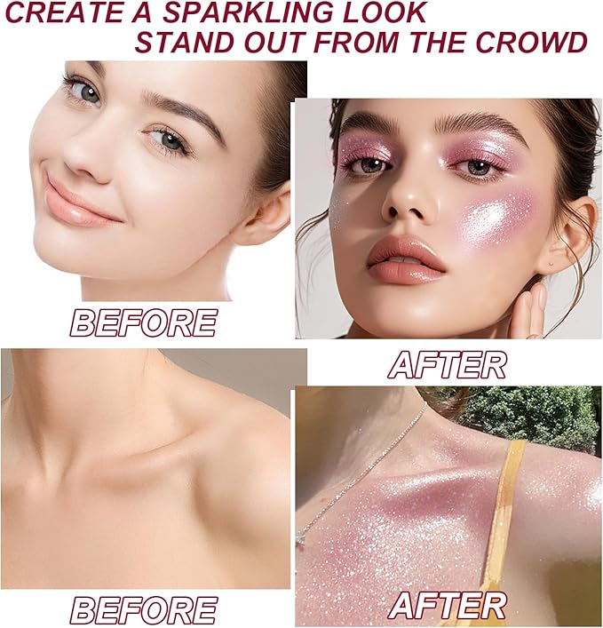 - Highlight Body Glitter Spray: Designed to enhance facial contours, it creates a stunning three-dimensional effect that catches the light beautifully. Add a radiant pop of color to your makeup and shine with effortless glamour!