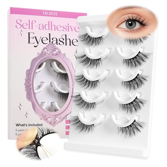 CALAILIS Self Adhesive Eyelashes 5 Pairs Natural Look Press On Lashes No Glue Need Eyelashes Reusable Cat Eye Wispy Self-adhesive False Lashes with Replacement Adhesive Strips (CP13)