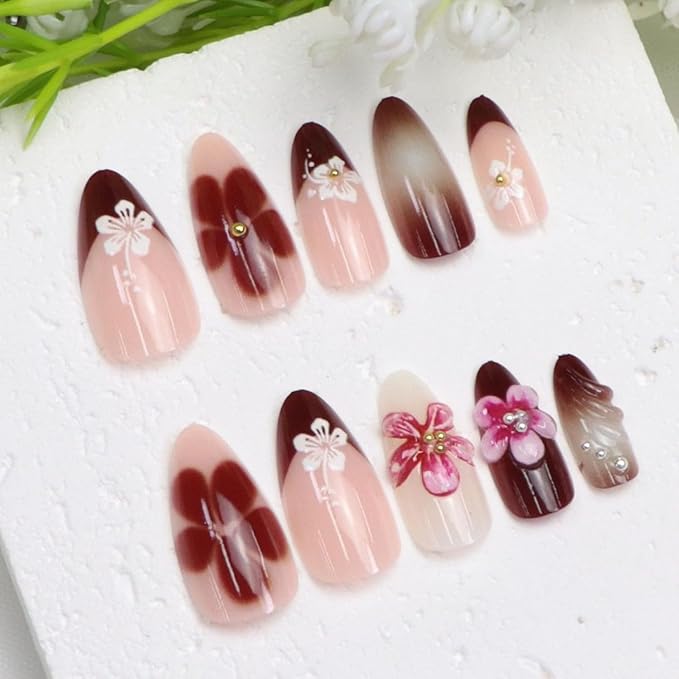 Almond Press on Nails Medium Fake Nails with 3D Flower Gold Pearl Designs French Tip Nails Press ons Pink Acrylic Nail Glossy Glue on Nail Gradient Stick on Nail for Women 24 Pcs