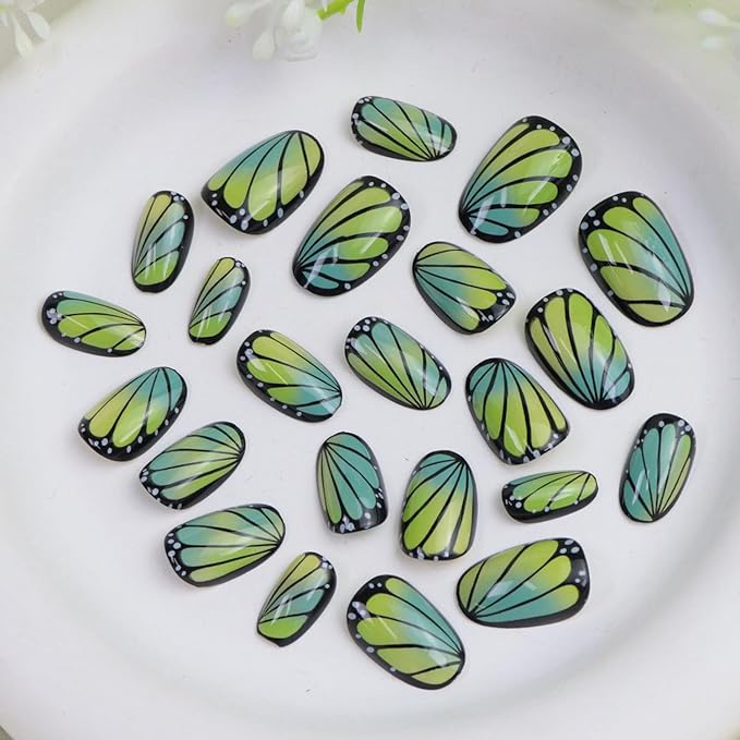 Short Press on Nails Oval Fake Nails with Cute Butterfly Designs Black Nails Press ons Yellow Green Gradient Acrylic Glue on Nail Spring Summer for Women 24 Pcs