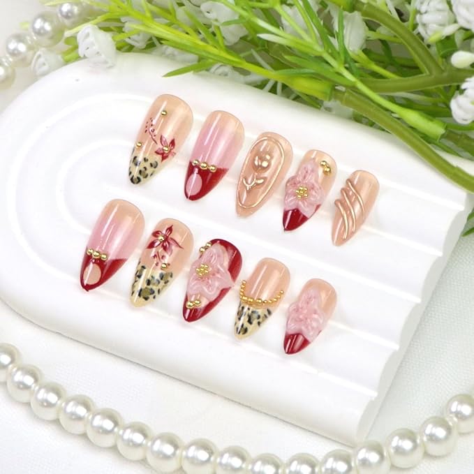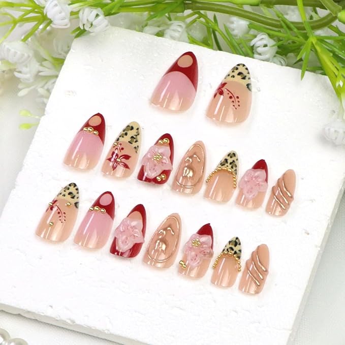 Short Press on Nails Almond Fake Nails with 3D Flower Gold Pearl Leopard Designs Red French Tips Nails Press ons Glossy Nude Pink Acrylic Nail Winter Fall Stick on Nail for Women 24 Pcs